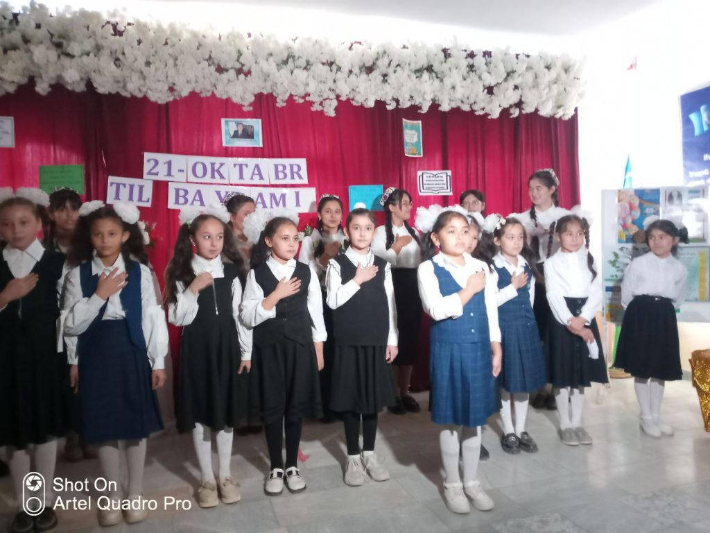 - Shu munosabat bilan 27-son maktabda «21-oktabr Til bayrami kuni»badiiy tadbir kechasi tashil qilindi.Ishbu tadbirda ona tili va adabiy fani òqituvchisi Jumaniyozova Gulnoza, MMIDO’ Muxamedova Rayxon,ma’naviy -marifiy ishlar bo’yicha targ’ibotchi Jumaniyozova Sarvinoz,maktab kutubxona mudiradi Abdullayeva Zamira,sinf rahbarlari,fan òqituvchilari hamda 8-11-sinf òquvchilari tomoshabin sifatida ishtirok qildilar.