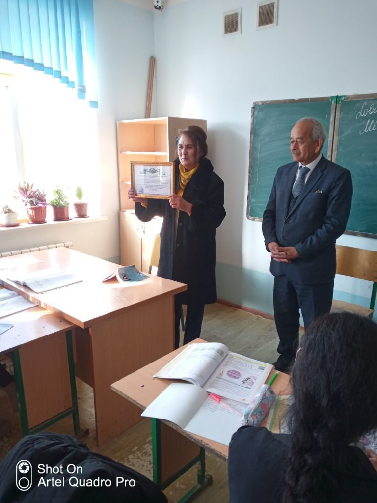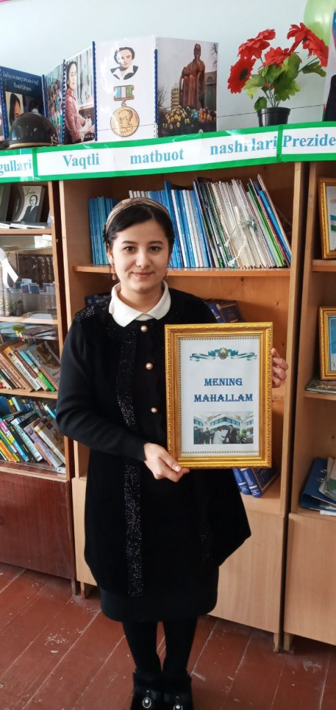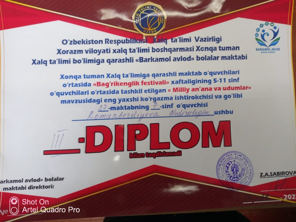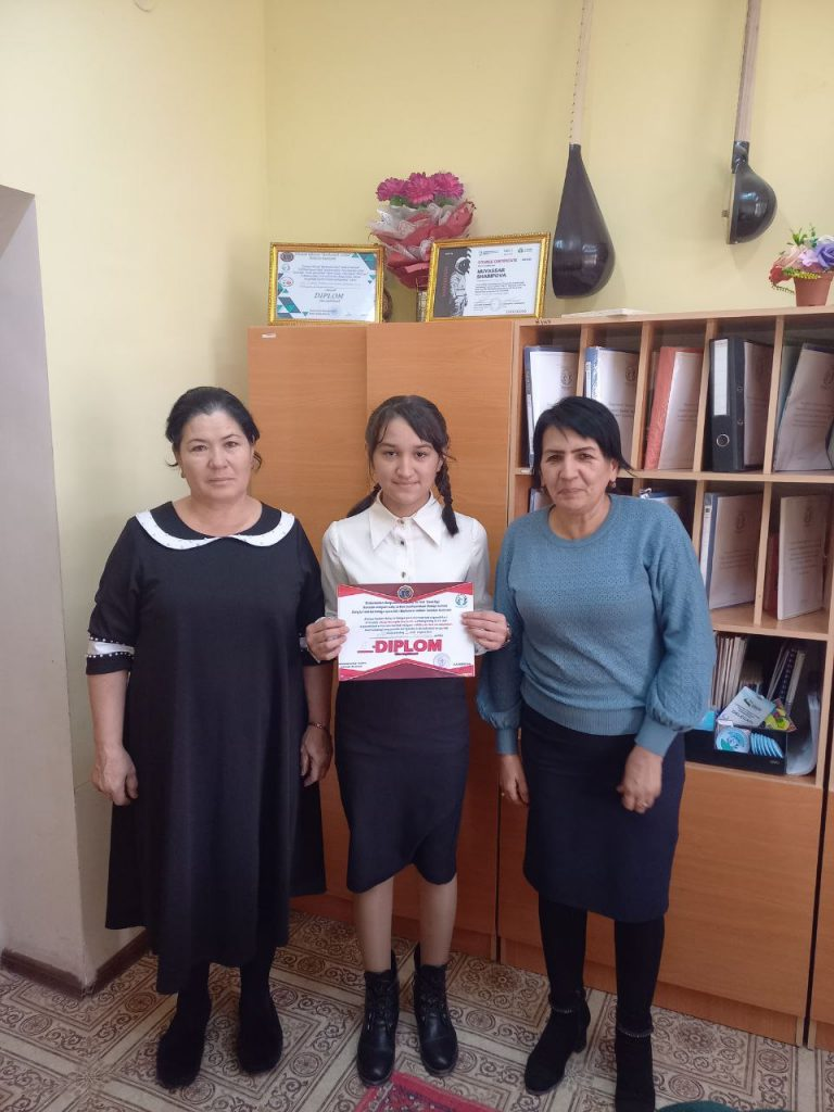 » Ilmli ayol-jamiyat kòzgusi» shiori ostida» XXl asr ayoli» xotin-qizlar festivalining » Bilim olib erishgan birinchi yutuģim»mavzusida òtkazilgan tanlovning tuman bosqichida faxrli 2-òrinni egalladi
