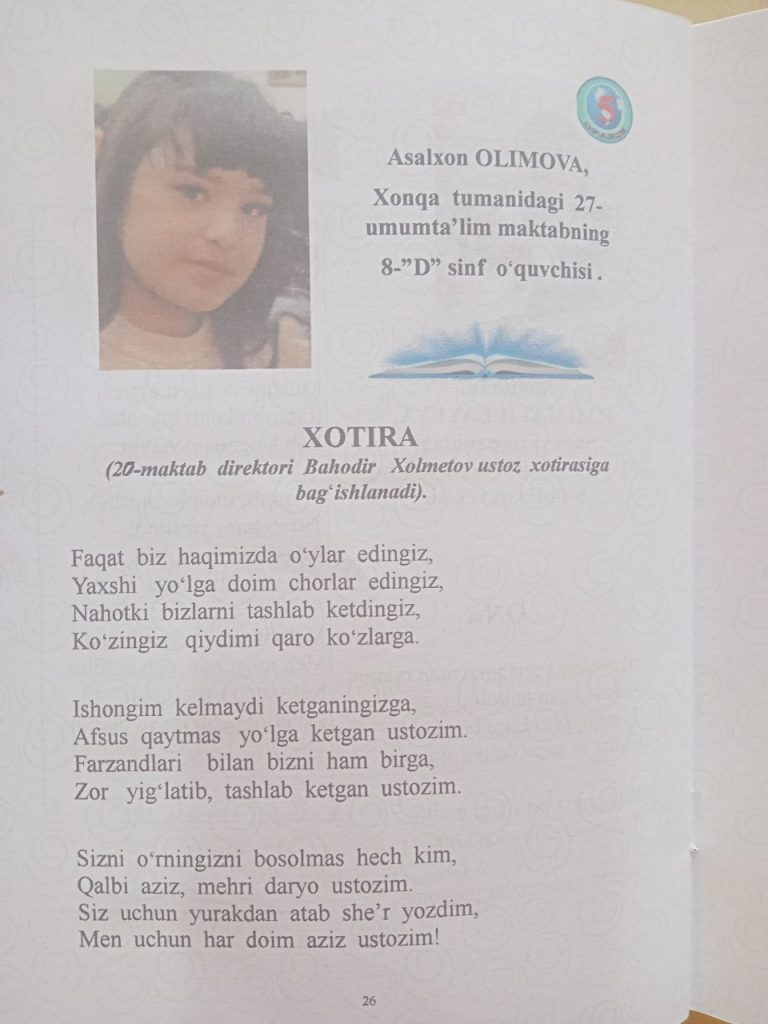 Хонқа туманидаги 27 -мактаб 8-Д ўқувчиси Асалхон Олимованинг шеъри «Гулғунчалар» китоби 3-жилдида чоп қилинди.Ўқувчимиз ижодиий изланишларида Омад тилаймиз.