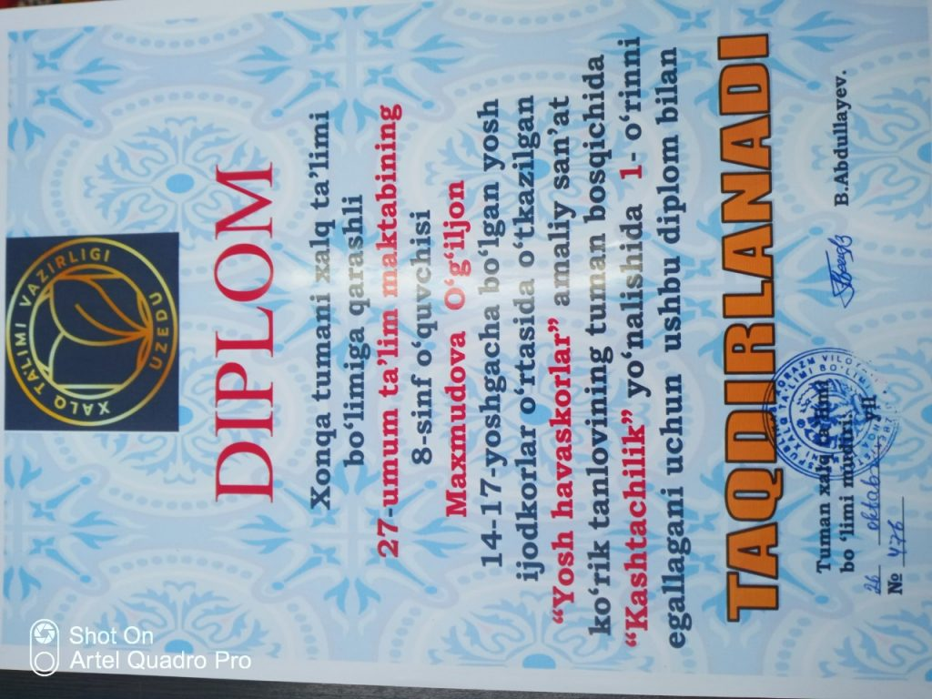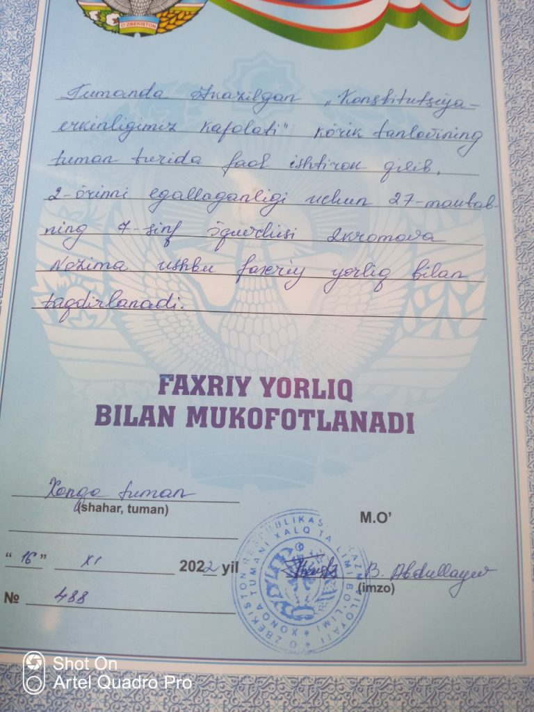 27- son umumta’lim maktabining 7-sinf o’quvchisi Ikromova Nozima «Konstitutsiya erlinligimiz kafolat»i insholar tanlovining tuman bosqichidа 2- o ‘rinni qo’lga kiritdi