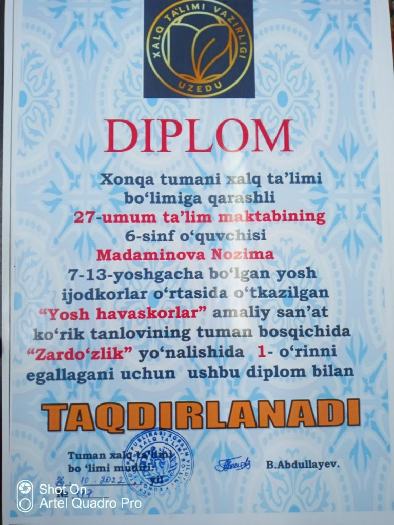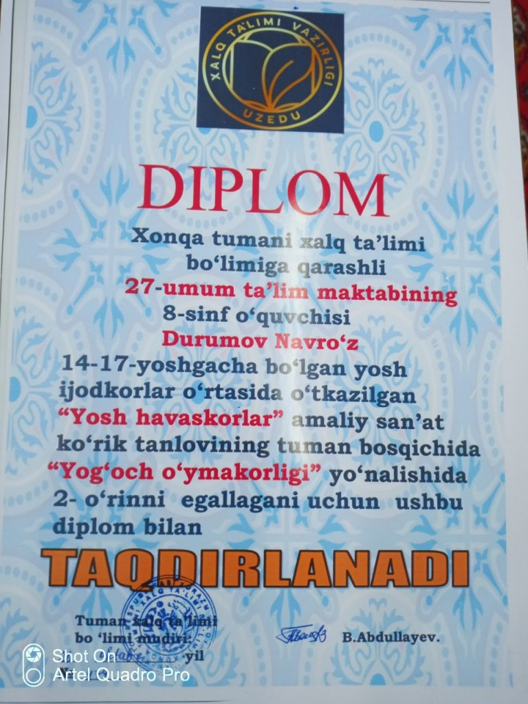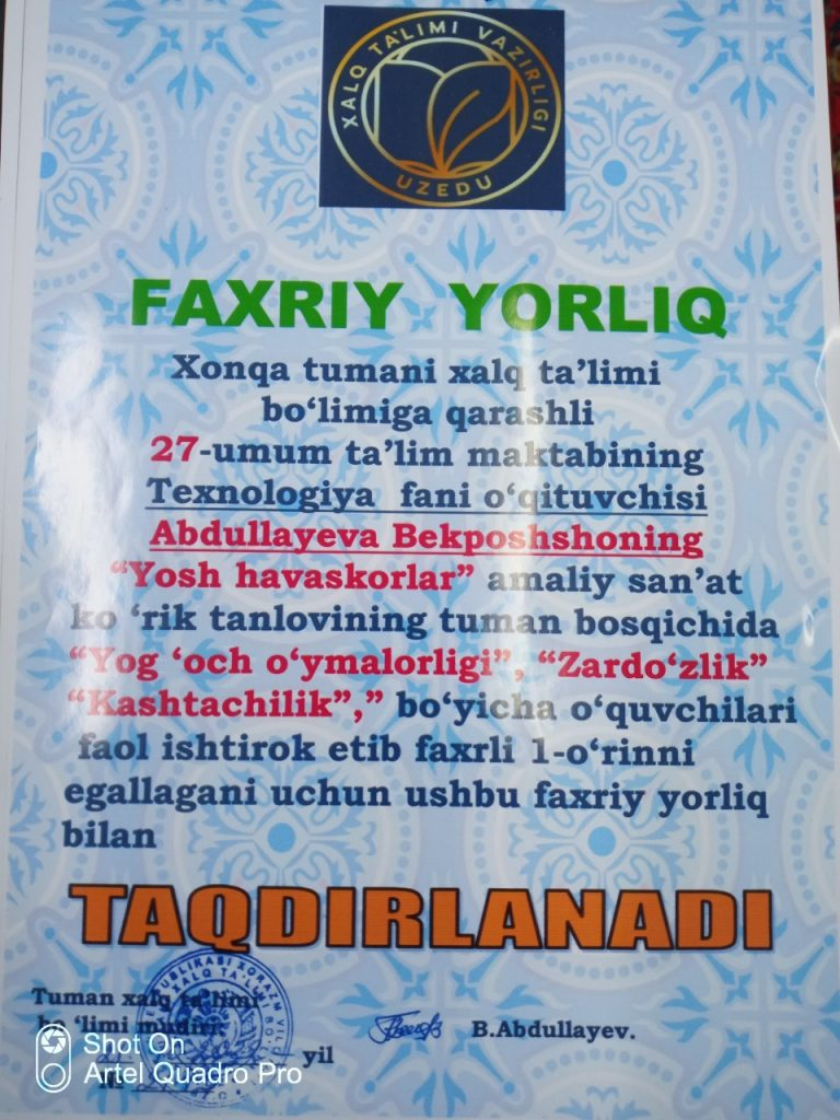 27- son maktabning Texnologiya fani o’qituvchisi Abdullaeva Bekposhsho ustozning «Yosh havaskorlar» amaliy san’at ko’rik tanlovining Yog’och o’ymakorligi, Zardo’zlik , Kashtachilik yo’nalishlarida bir guruh o’quvchilari faol ishtiroq qildilar, tanlovning tuman bosqichida faxrli 1-o’rinni egallab , viloyat bosqichida qatnashish imkoniyatini qo’lga kiritdilar